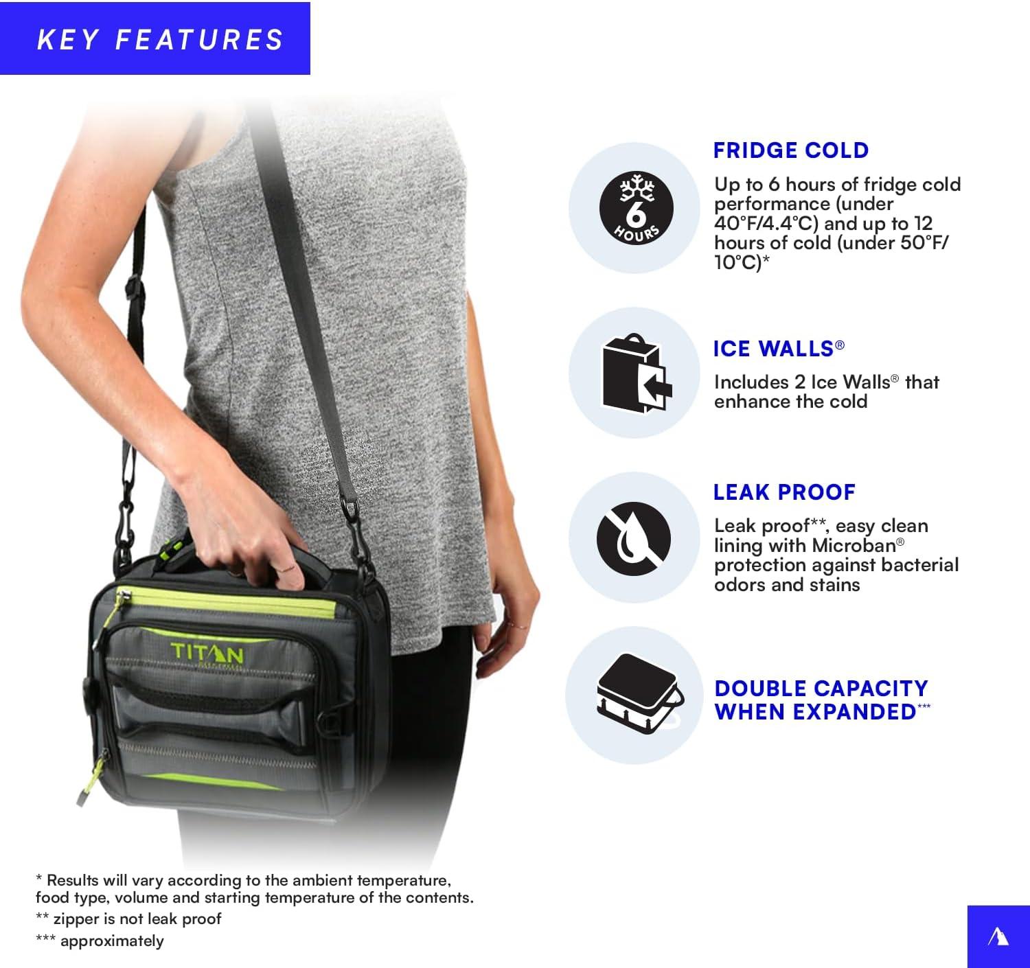 YOUR OWN PERSONAL MINI-FRIDGE: This Titan lunch box keeps meals Fridge Cold (40°F/4.4°C) up to 6 hours and chilled (50°F/10°C) up to 12 hours!* Perfect for school, work and everyday adventures.